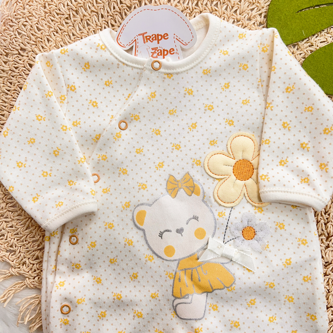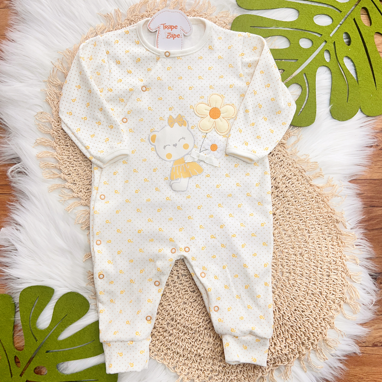 Macacão Trape Zape - Ursinha Adoro Flores - Off White e Amarelo