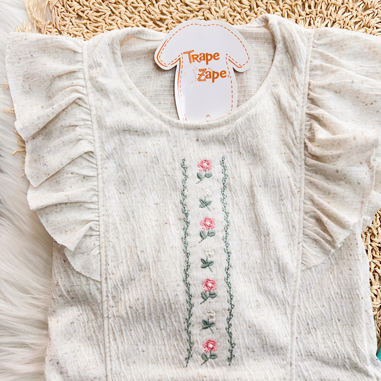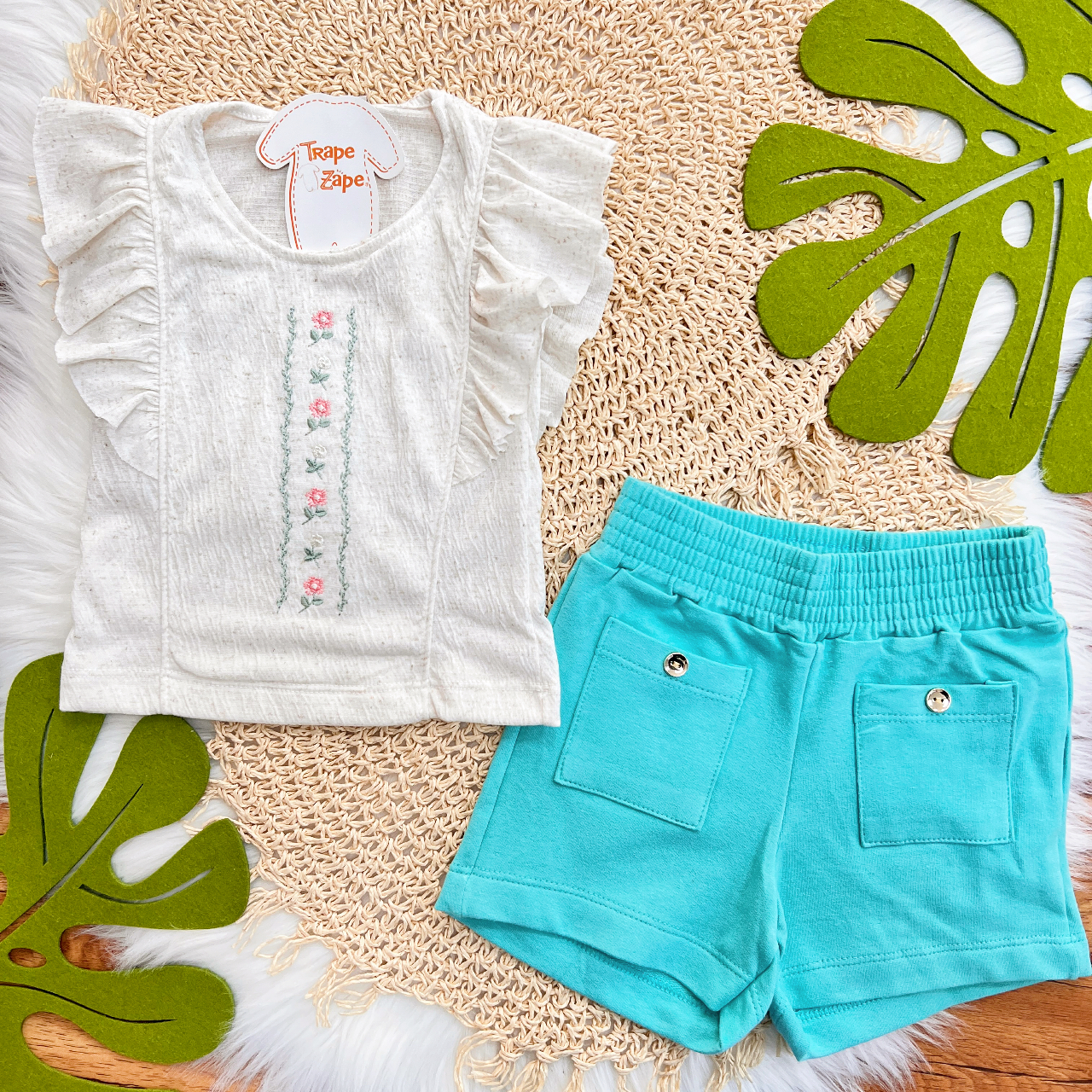 Tags:Conj., Batinha, Linho, Flores, Bordadas, Short, Verde, Areia