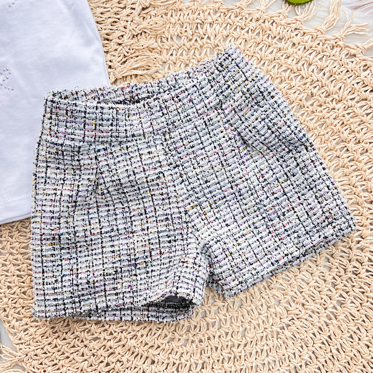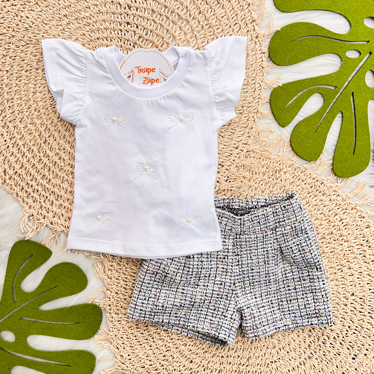Tags:Conj., Blusa, Strass, Pérola, Short, Tweed, Branco