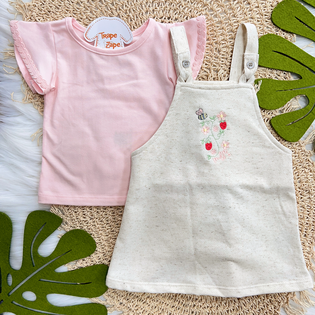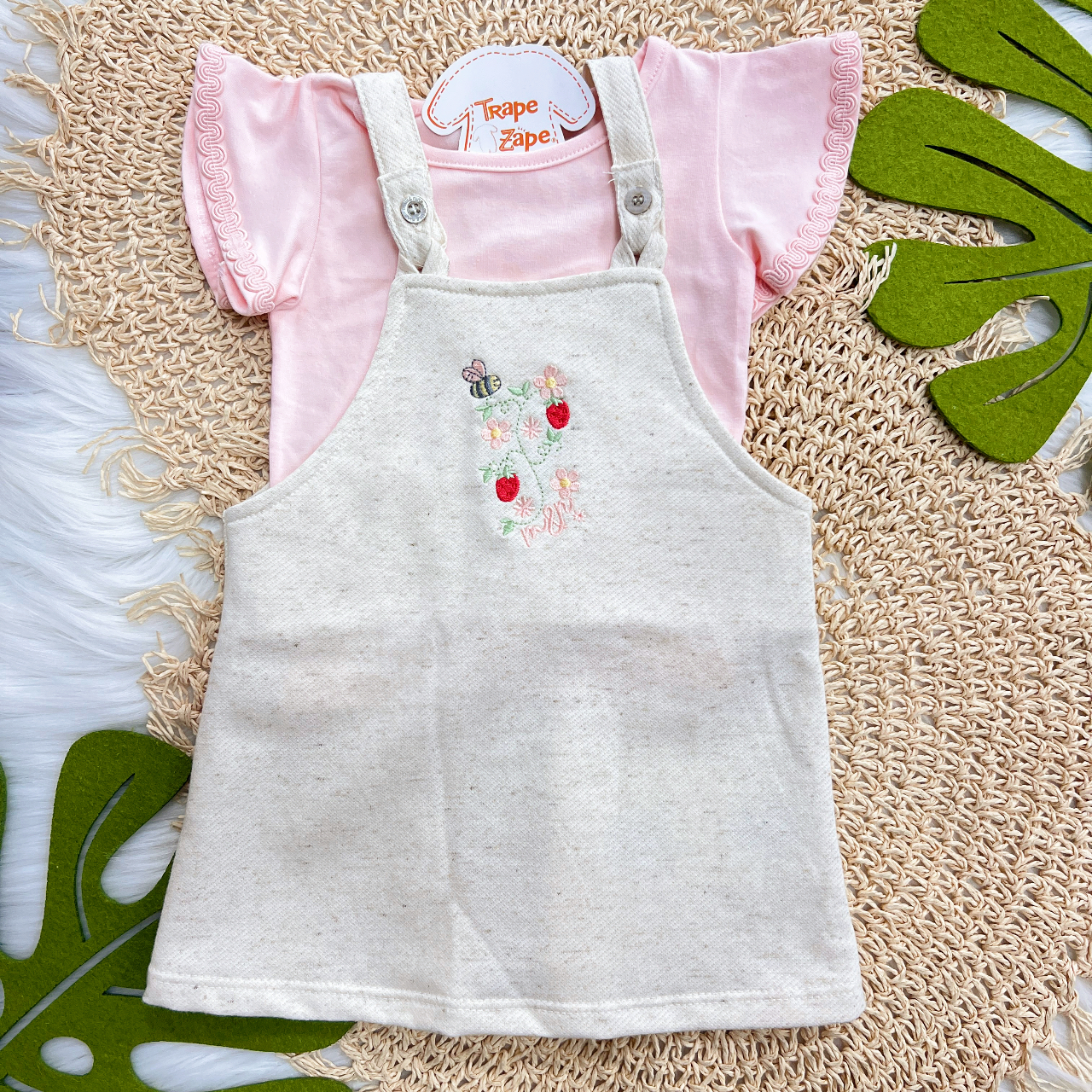 Tags:Conj., Blusa, Manga, Rendada, Salopete, Moranguinhos, Abelhinha, Areia