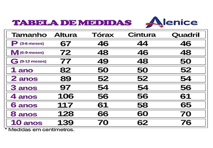 *Tamanhos de referência, podendo variar de criança para criança.