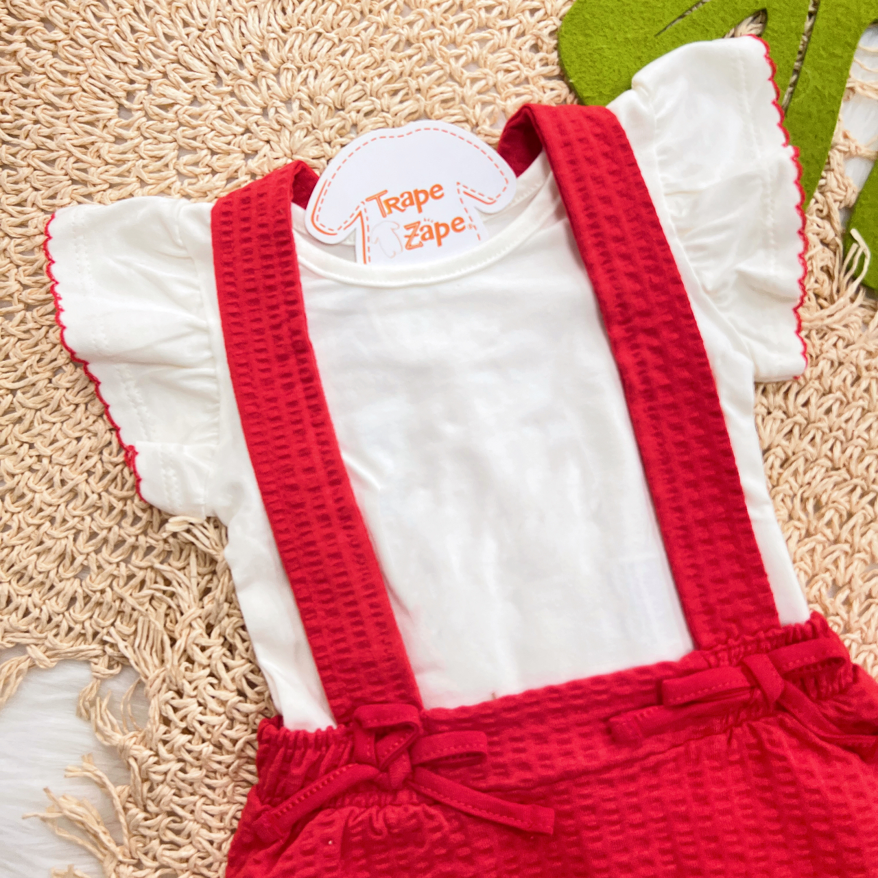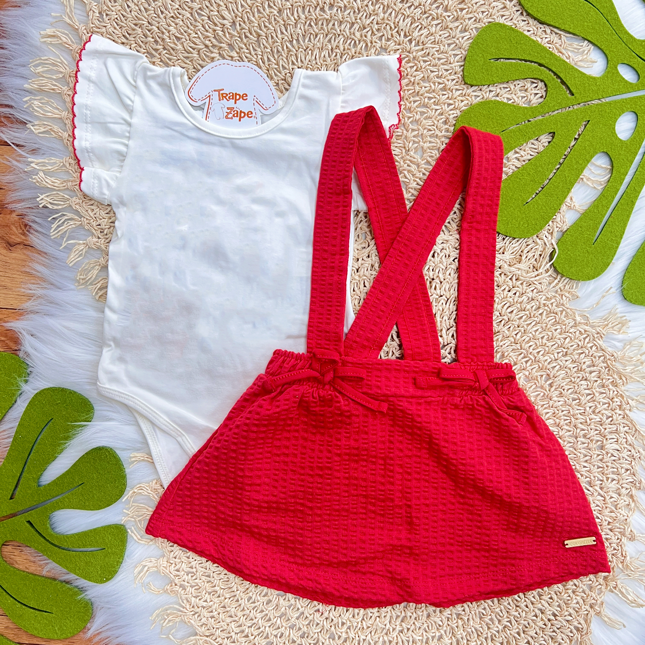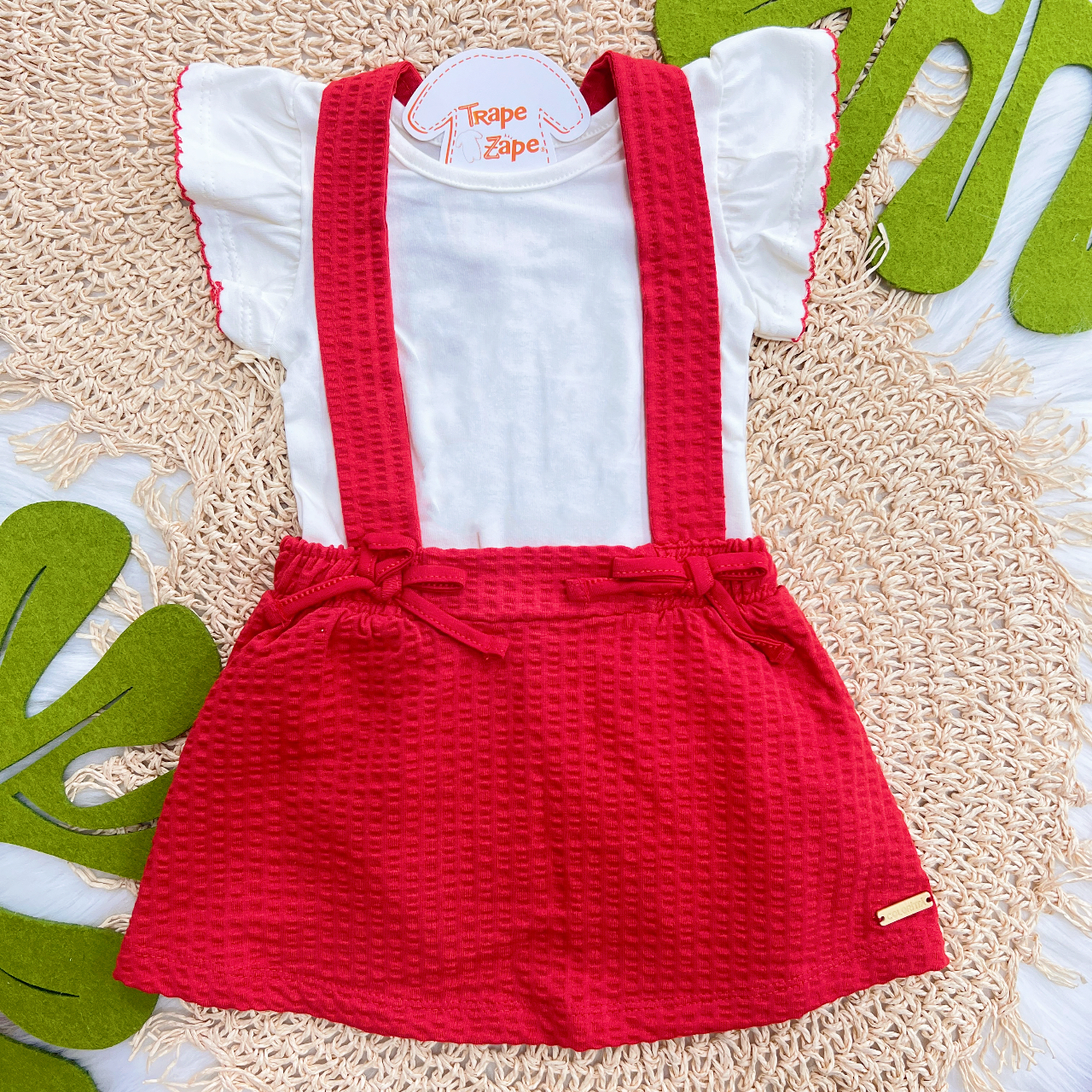 Tags:Conj., Manga, Curta, Salopete, Laços, White, Vermelho