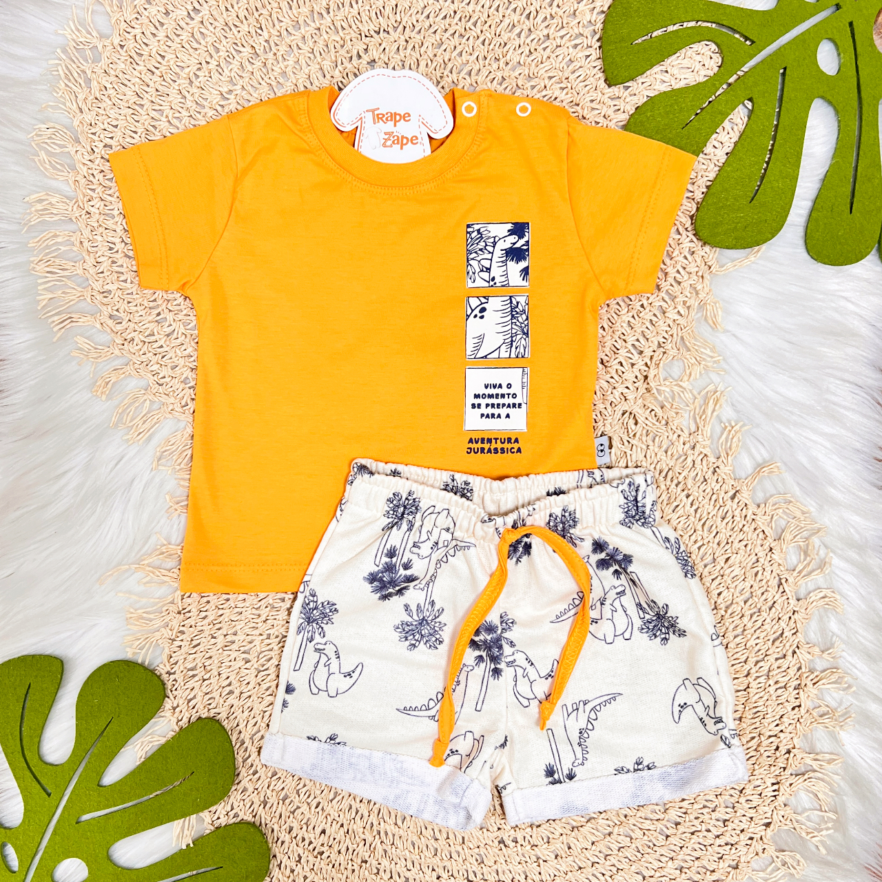 Tags:Conj., Camiseta, Aventura, Jurássica, Bermuda, Dinos, Laranja, Areia