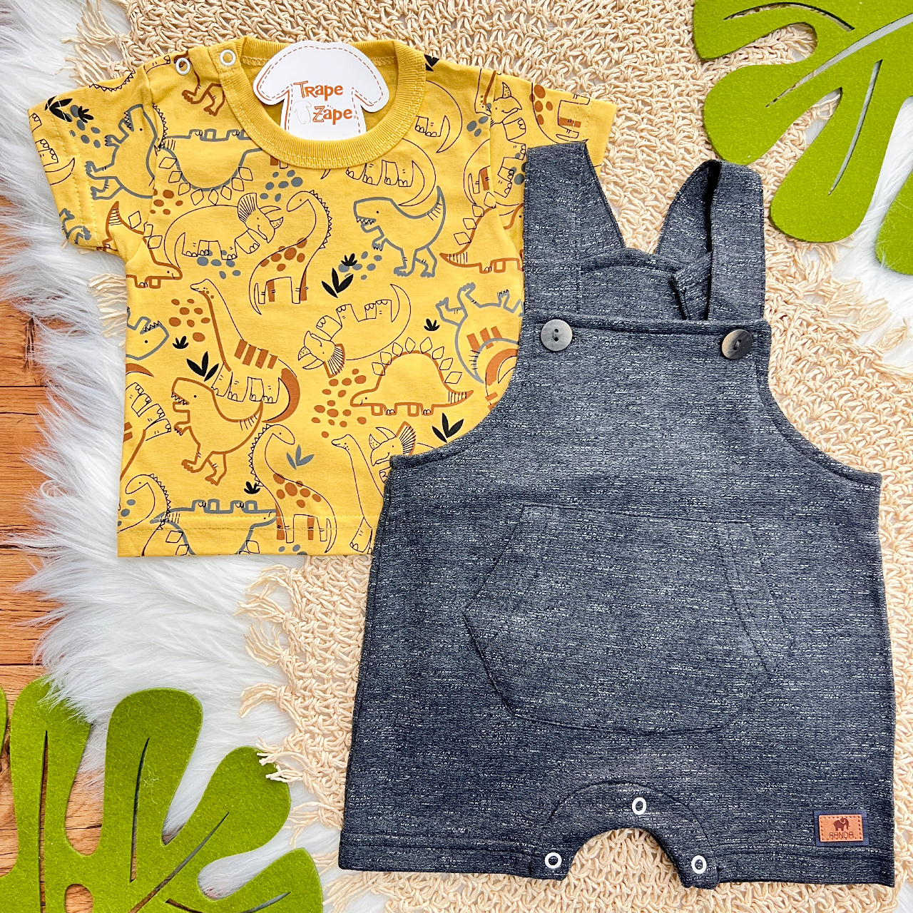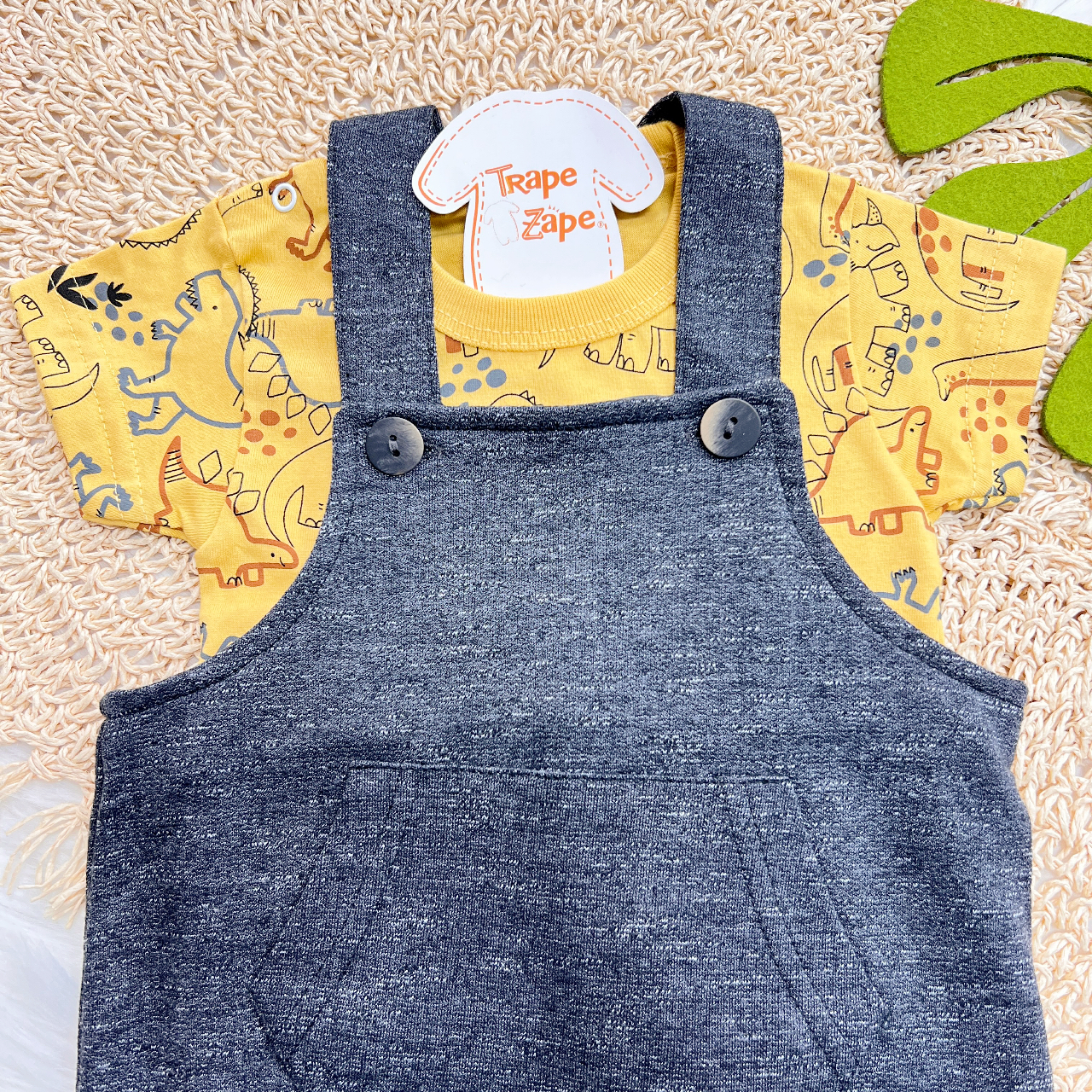 Tags:Conj., Camiseta, Dinos, Jardineira, Moletinho, Chumbo, Amarelo, Deserto
