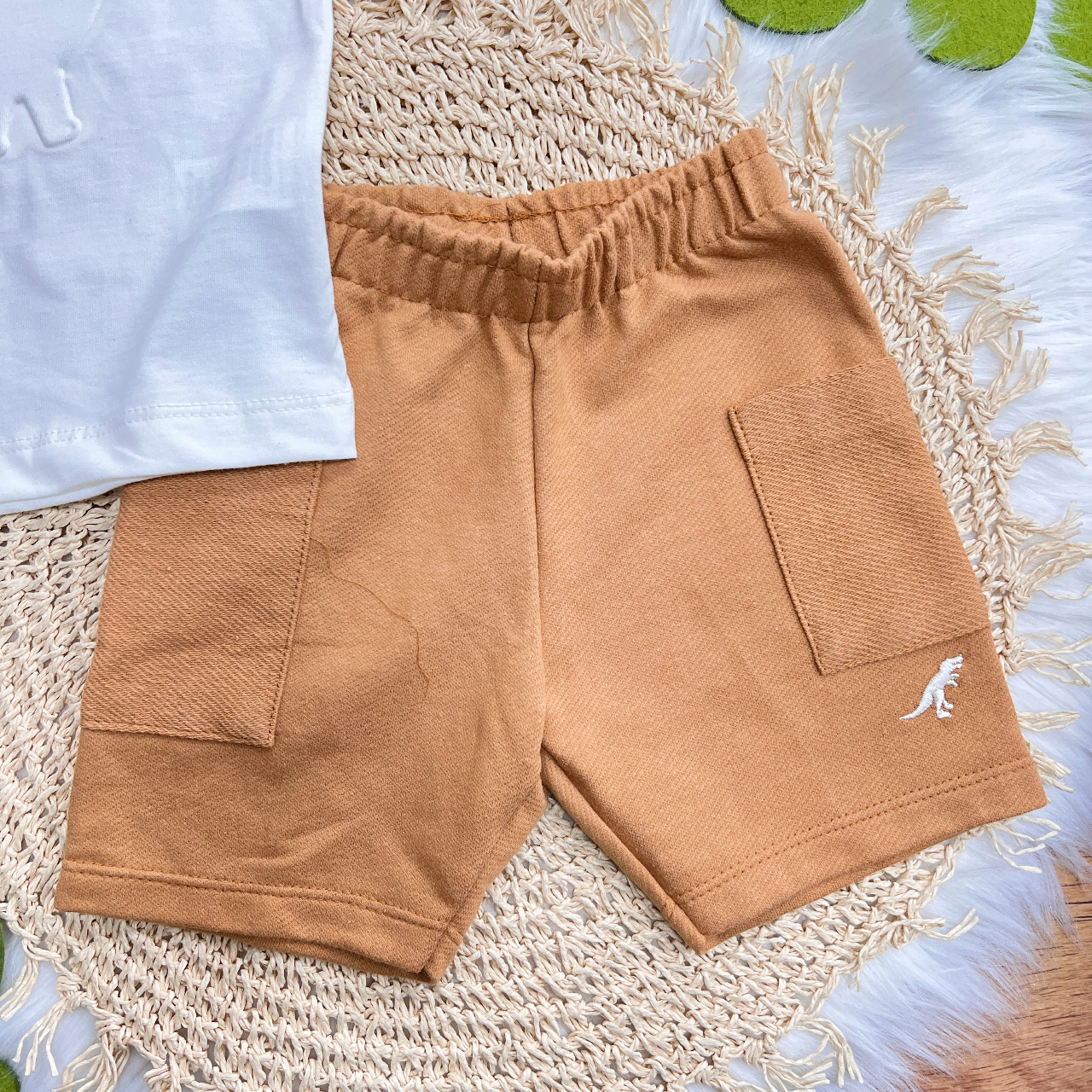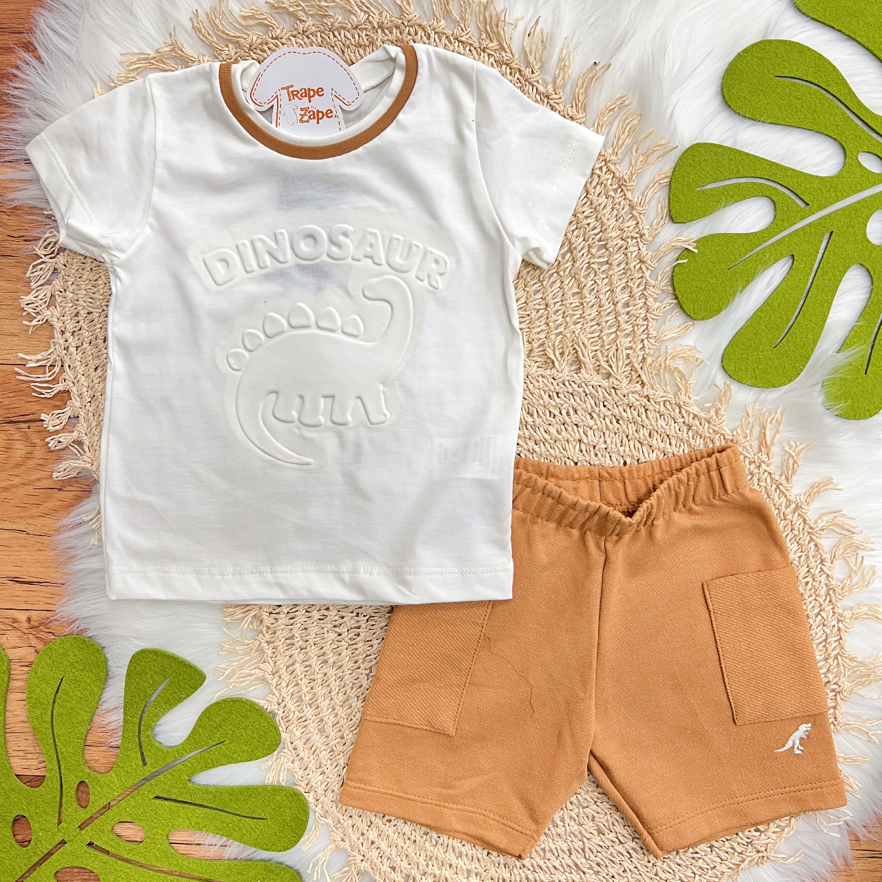 Tags:Conj., Camiseta, Dinossaur, Bermuda, Moletinho, White, Caramelo