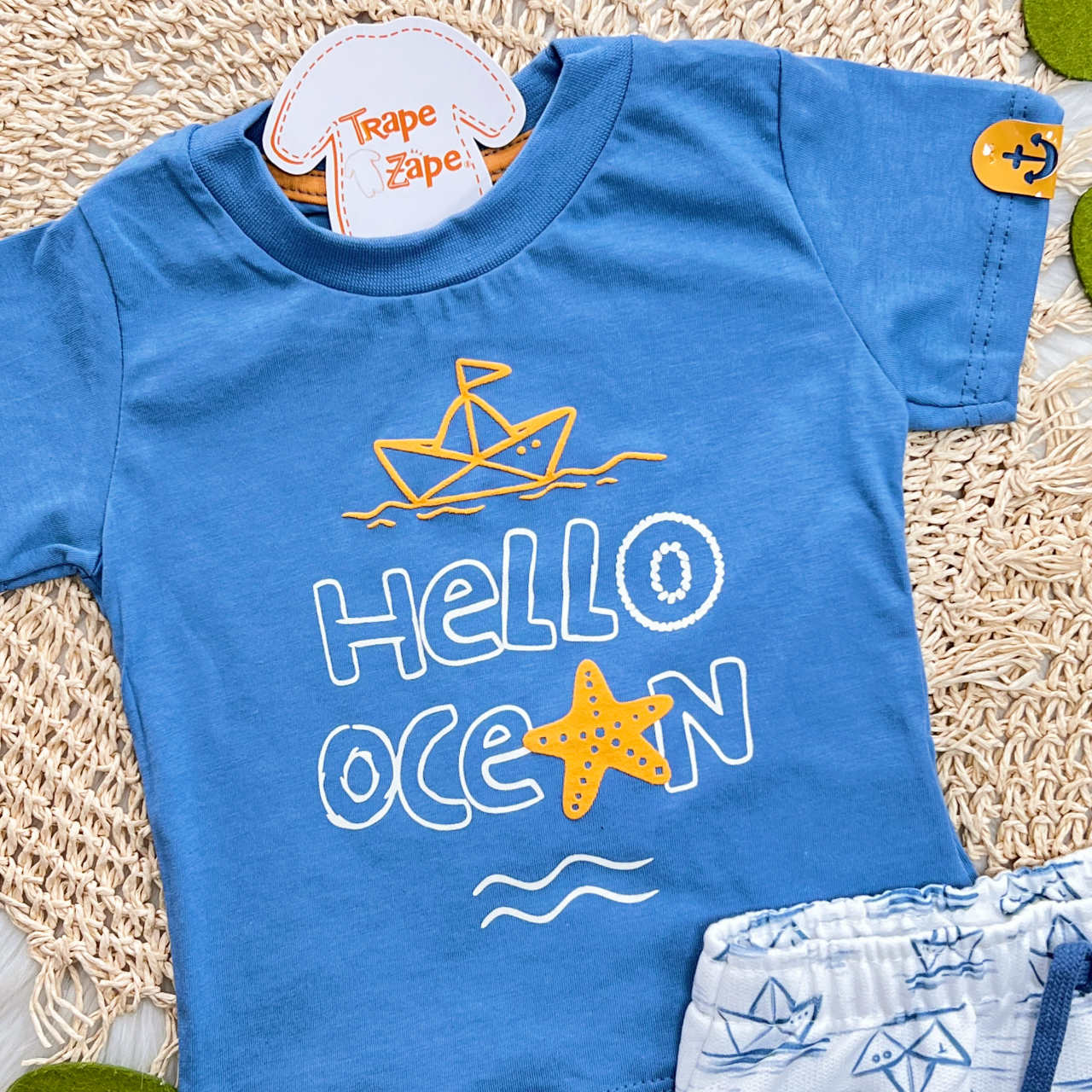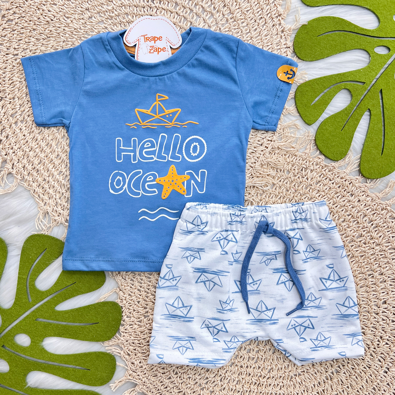 Tags:Conj., Camiseta, Hello, Ocean, Bermuda, Barquinhos, Papel, Jeans, Laranja