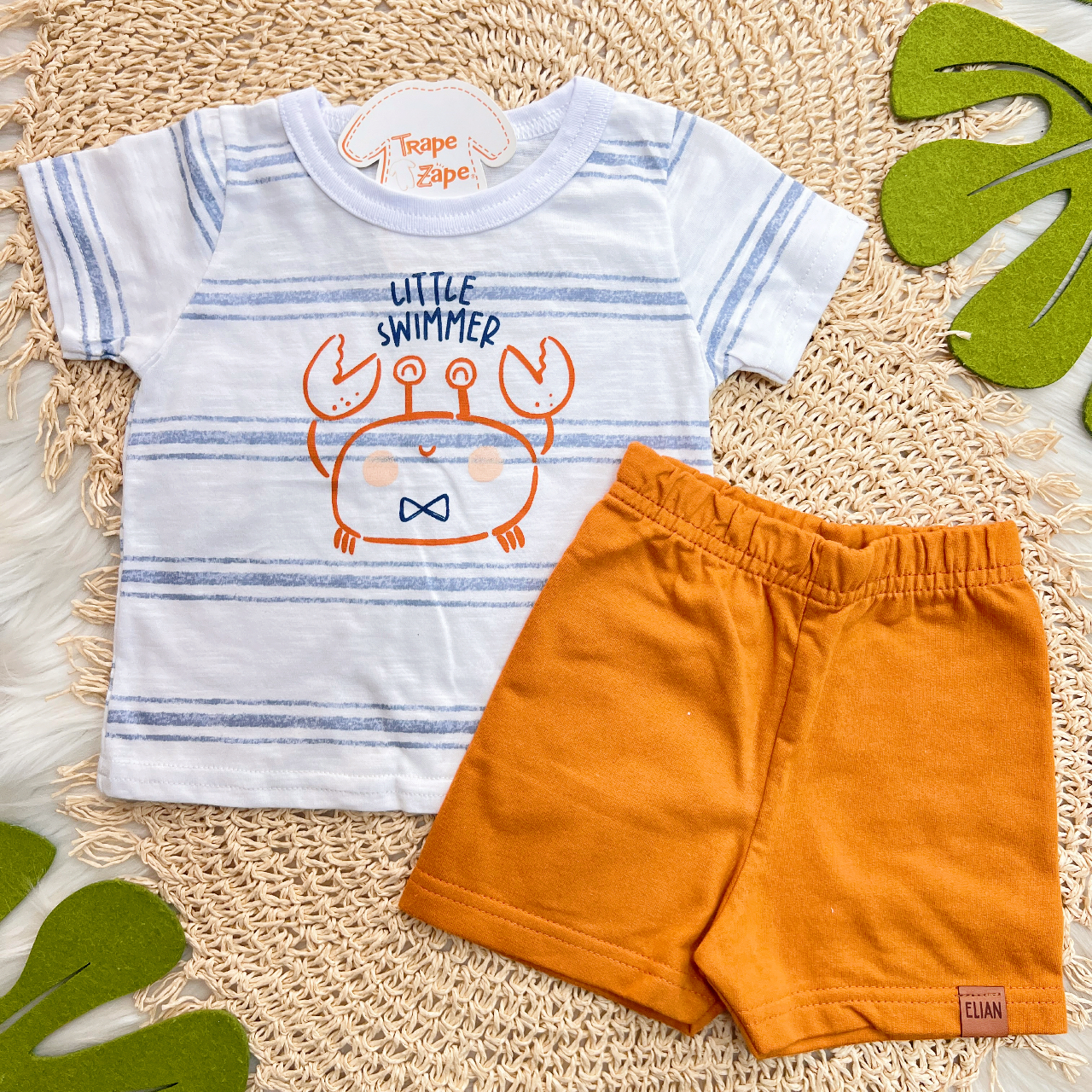 Tags:Conj., Camiseta, Little, Swimmer, Listrado, Bermuda, Branco, Laranja