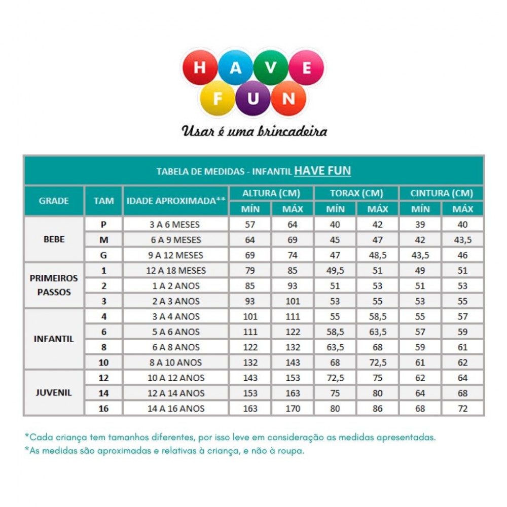 *Tamanhos de referência, podendo variar de criança para criança.