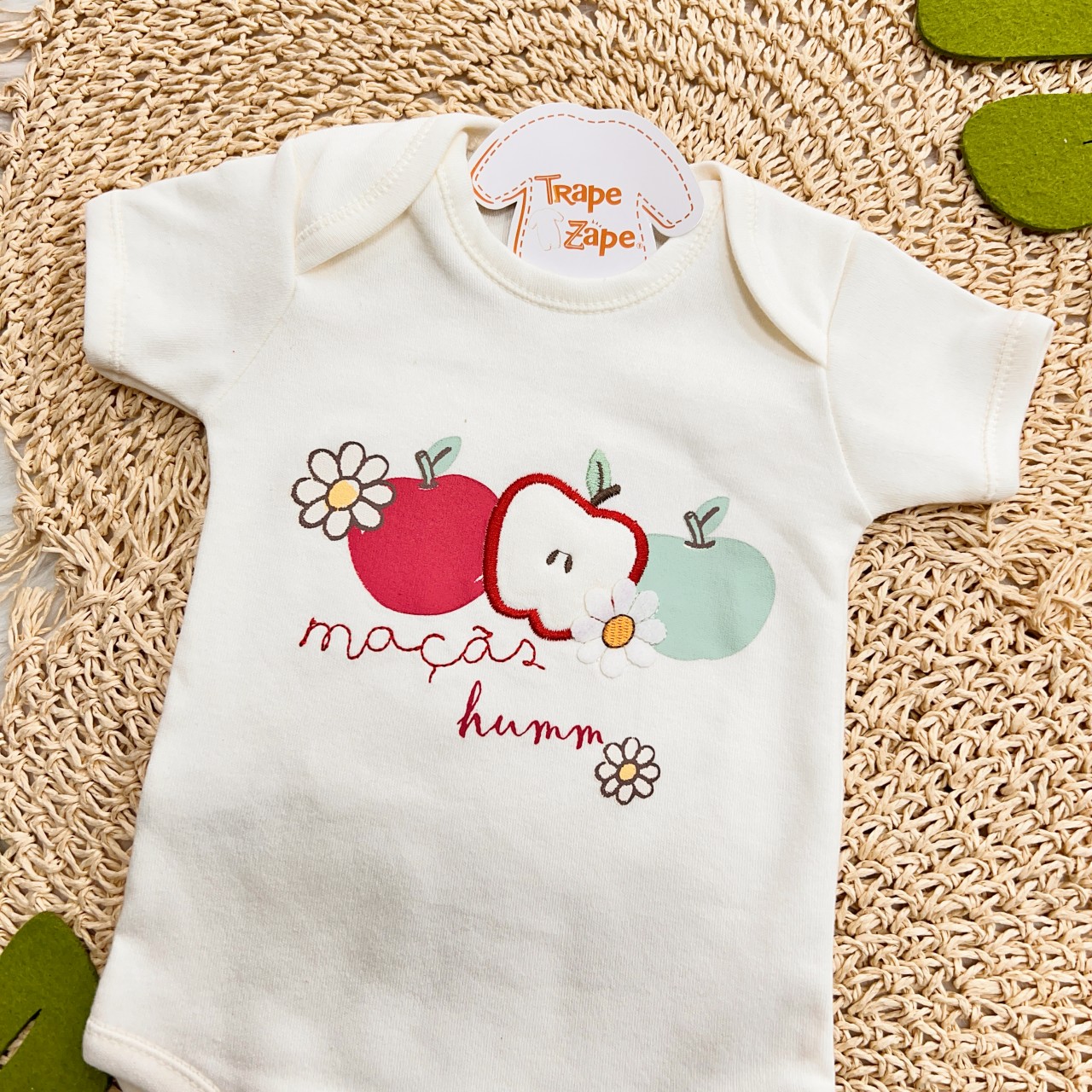 01 - Body Malha Suedine Manga Curta Maçãs - 100% Algodão