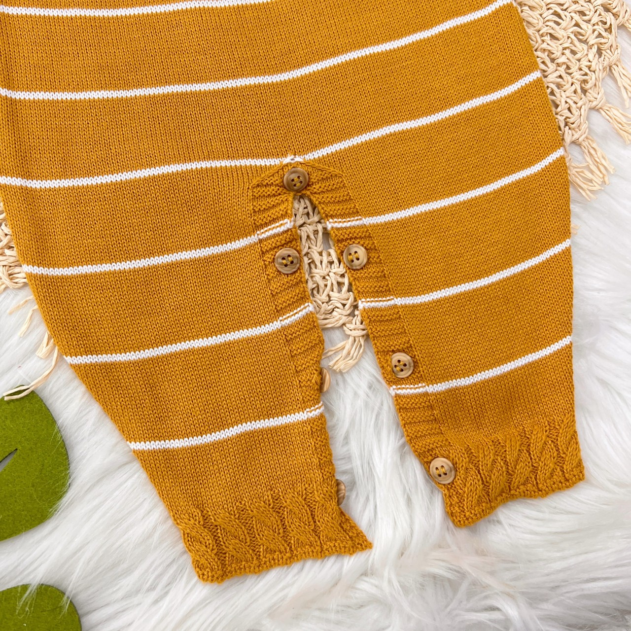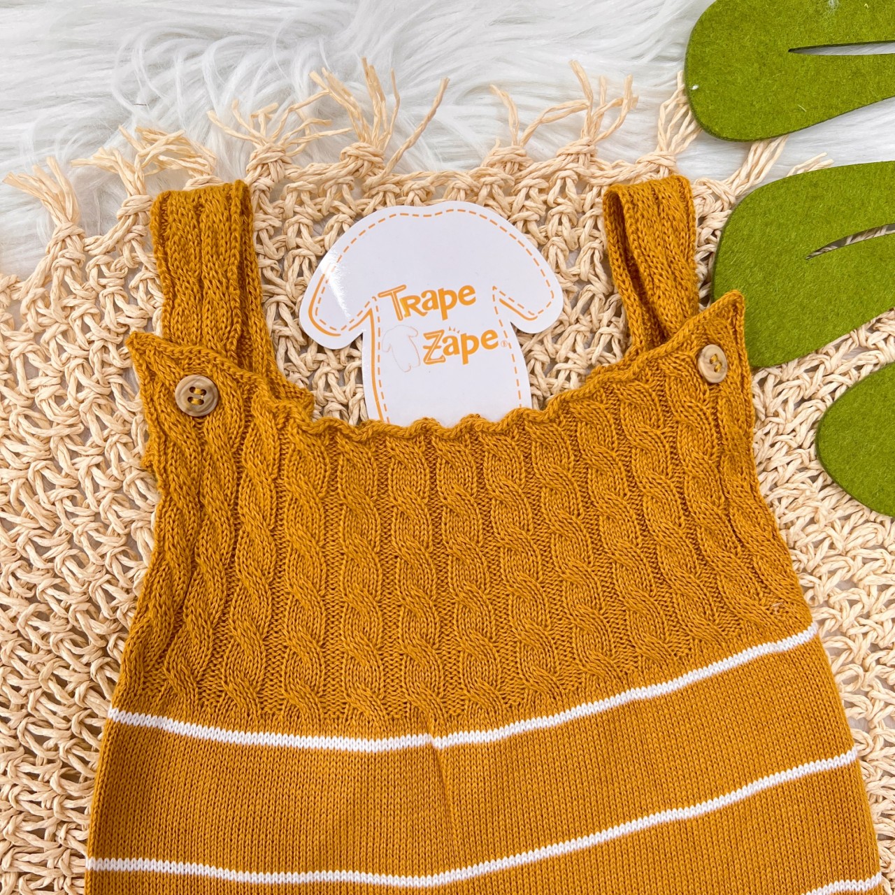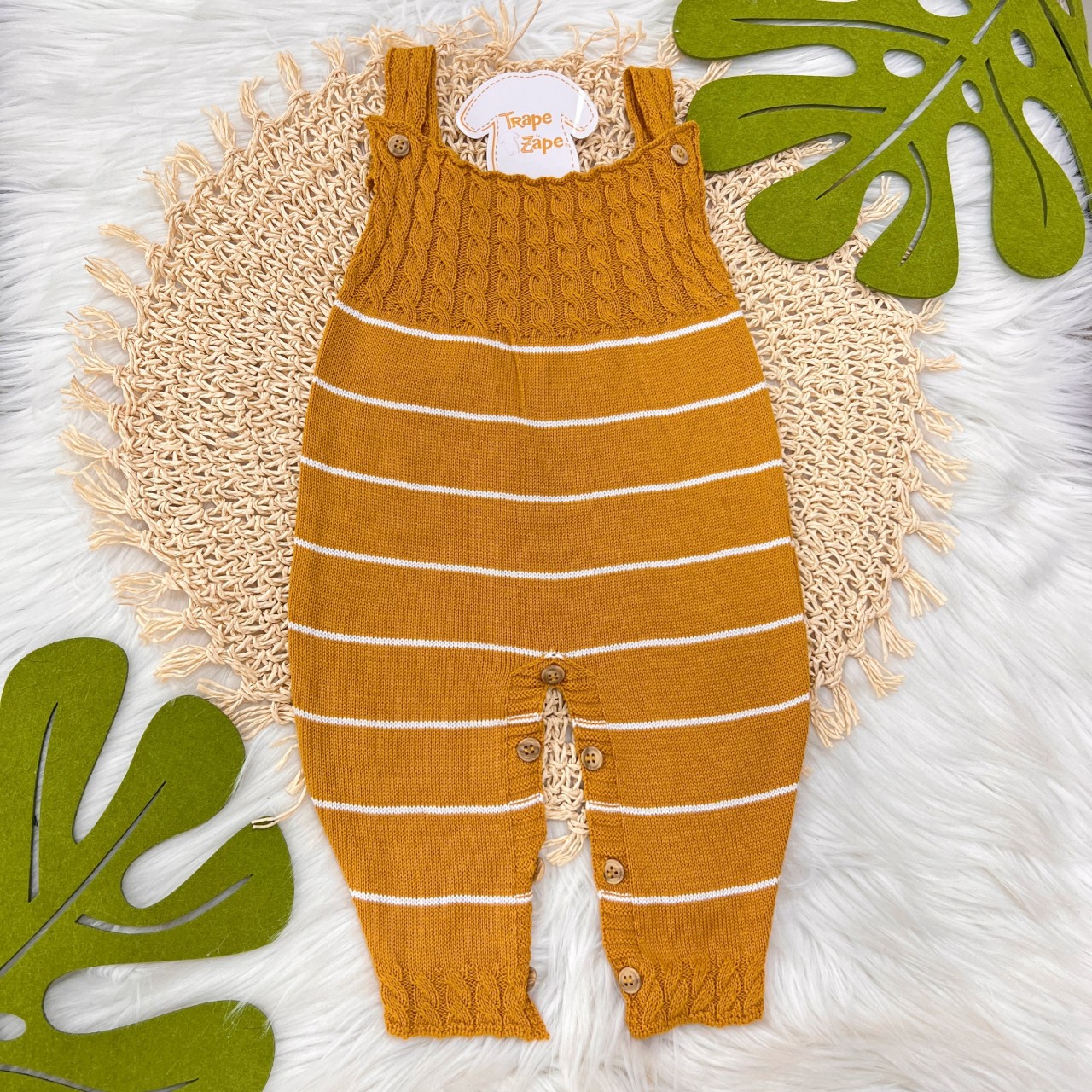 - Modelo: Jardineira Longa de Linha - Mostarda com Listras Brancas