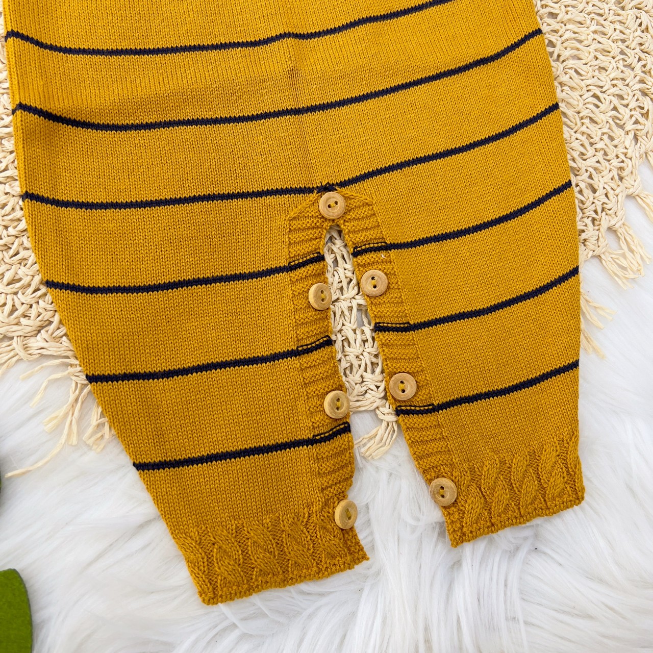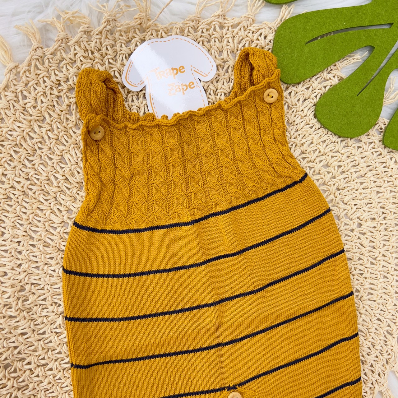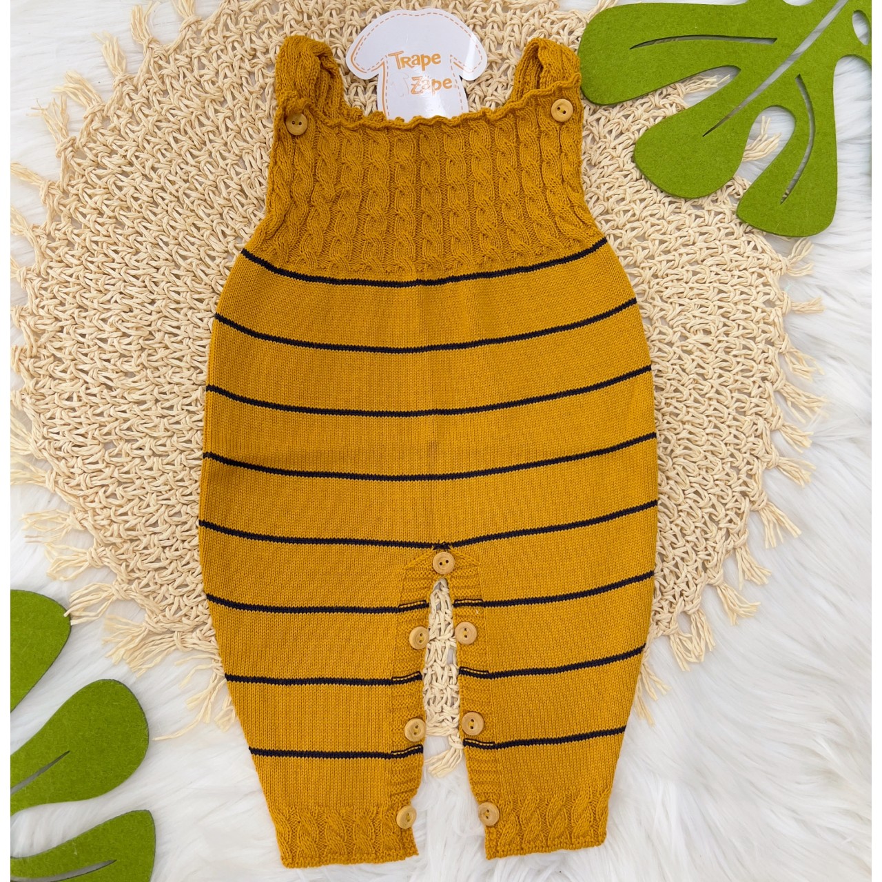 - Modelo: Jardineira Longa mostarda com listras finas marinho