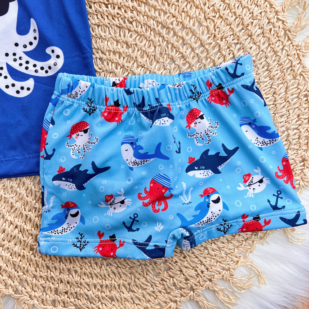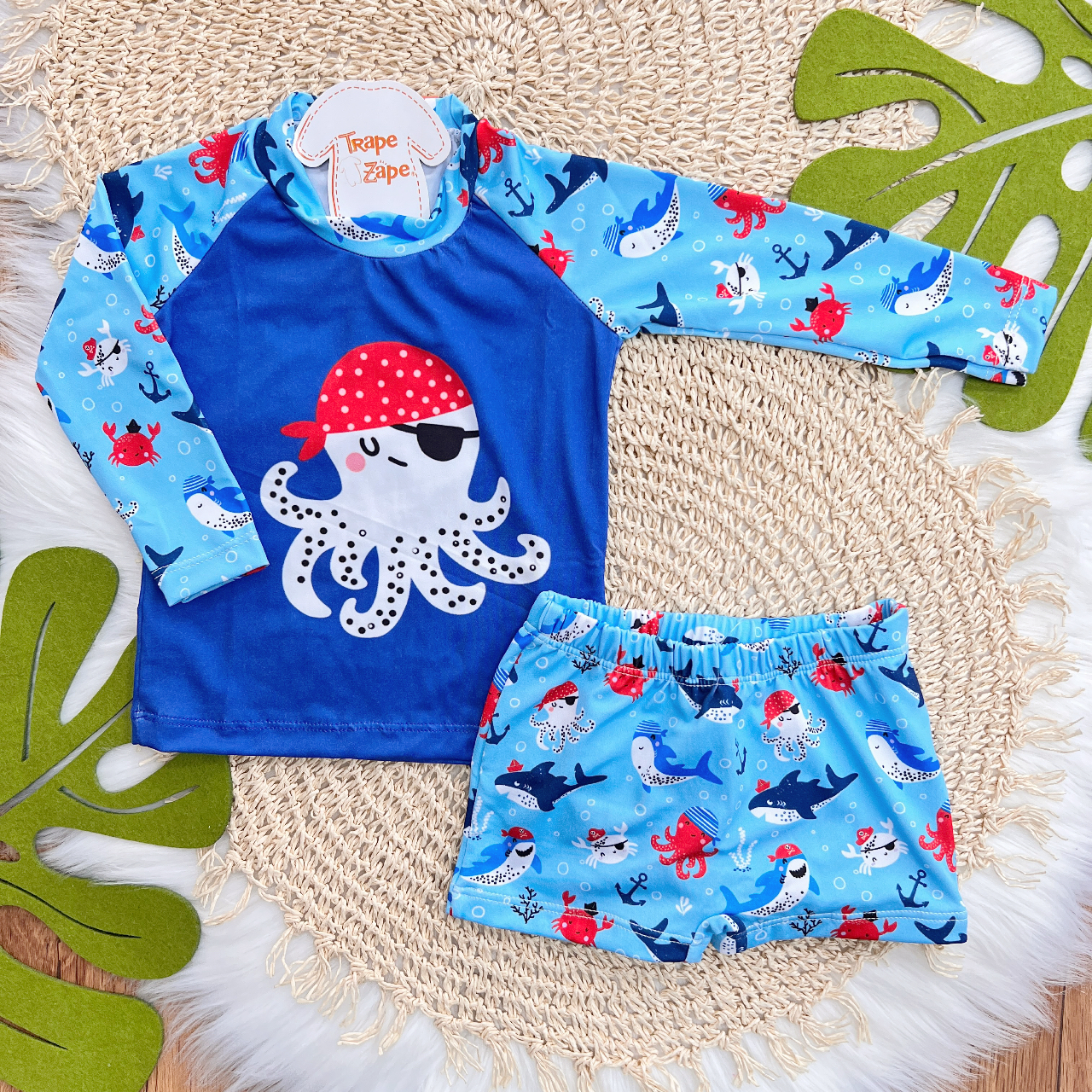 Tags:Linha, Praia, Camiseta, Proteção, UV50+, Sunga, Polvo, Pirata, Claro, Marinho