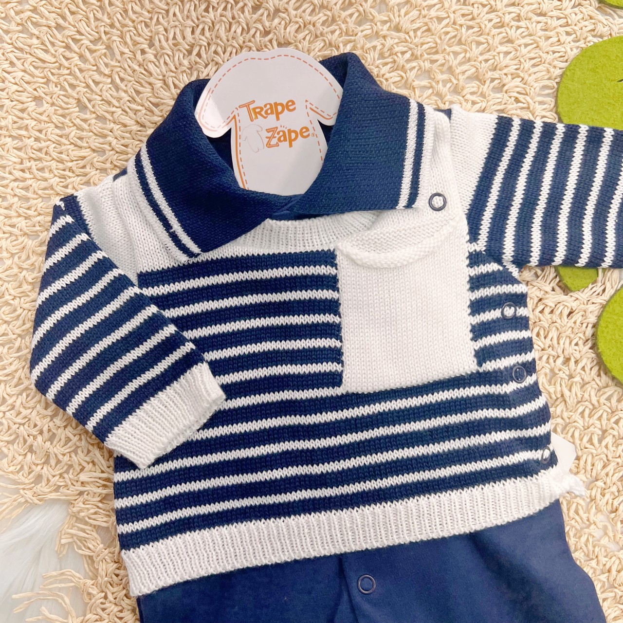 - Modelo: Macacão de Tricot com Bolsinho - Marinho e Branco