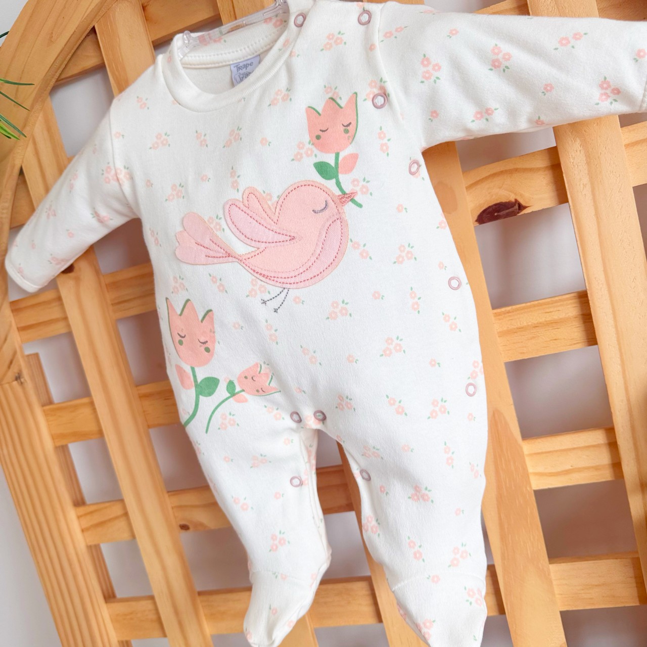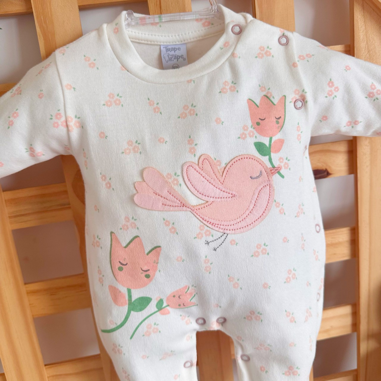 Macacão Malha Trape Zape - Passarinha com Flores - Off White e Rose