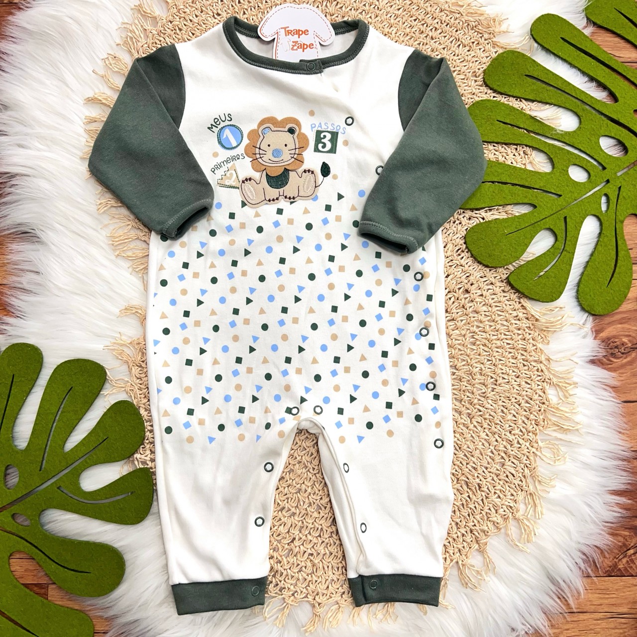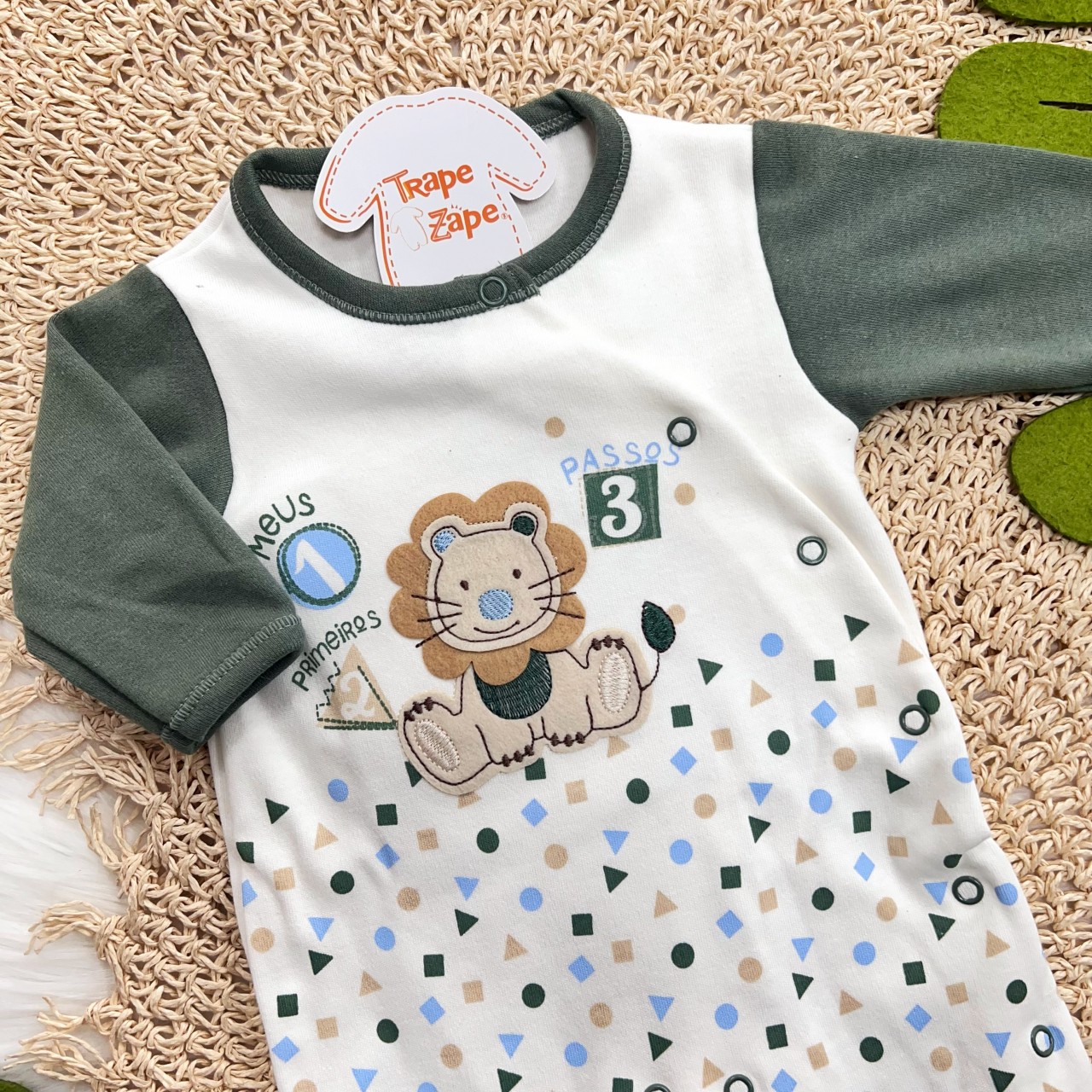 - Modelo: Macacão Malha Trape Zape - Primeiros Passos - Off e Verde