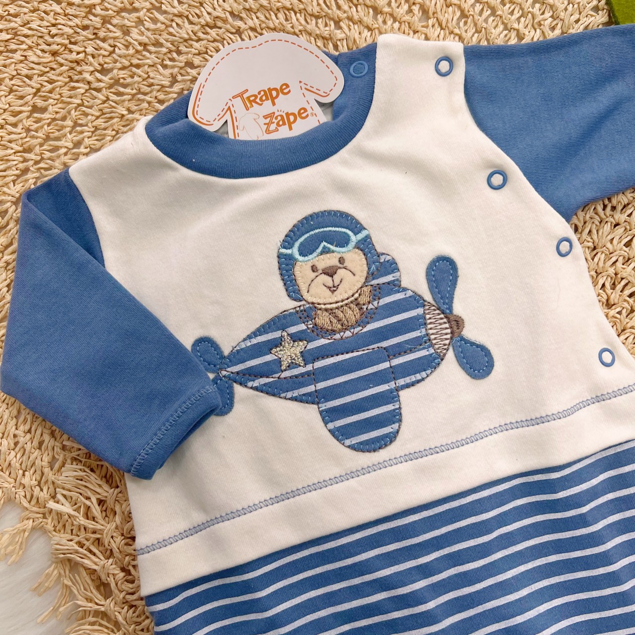 - Modelo: Macacão Malha Trape Zape - Urso Aviador - Azul Jeans
