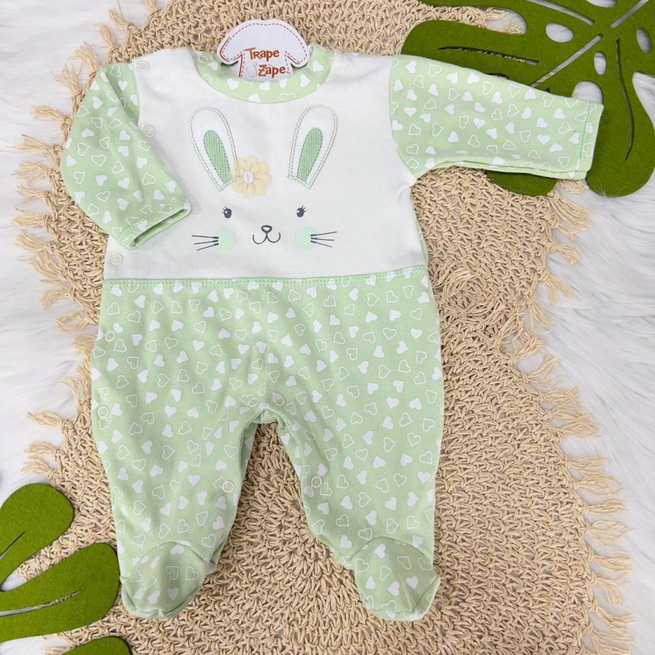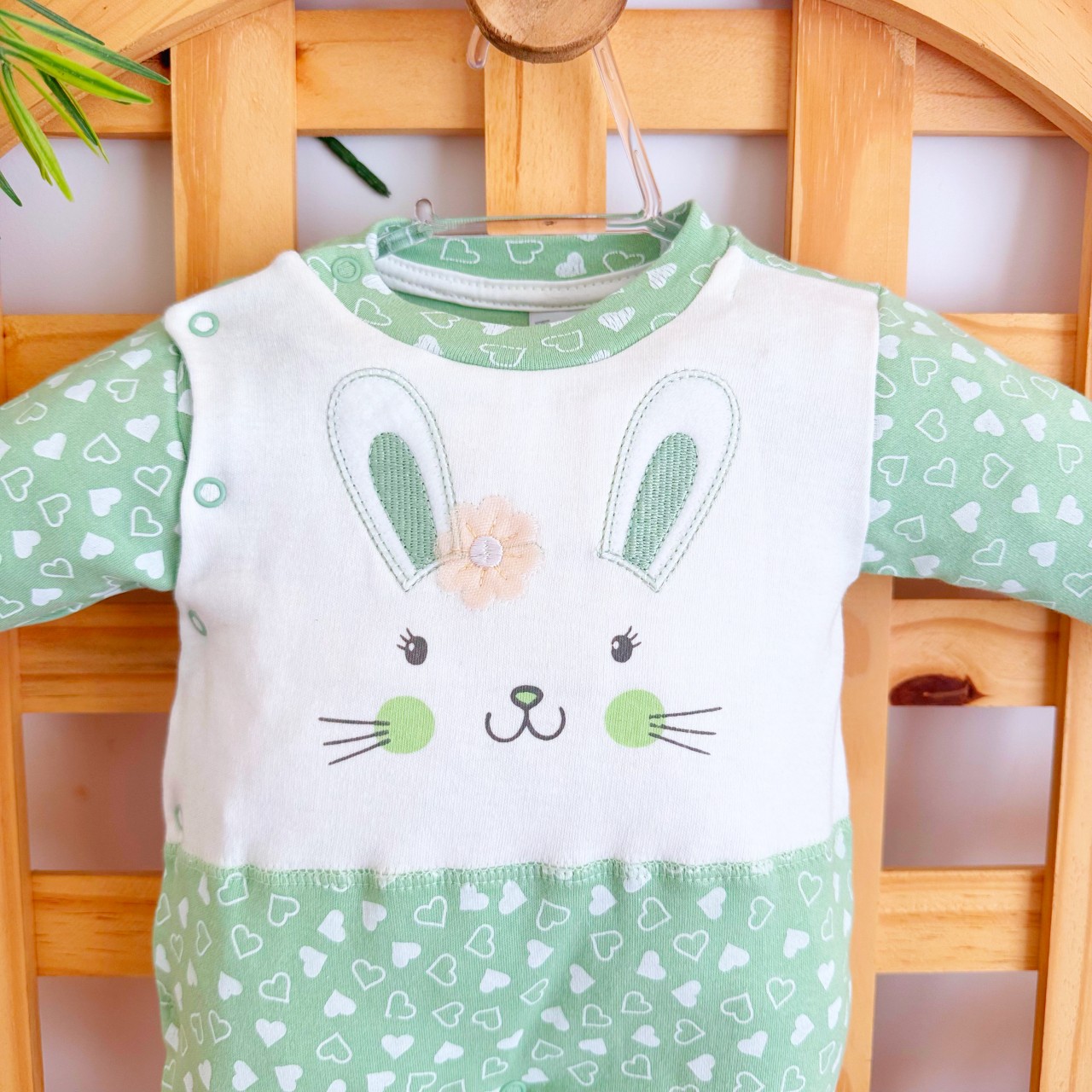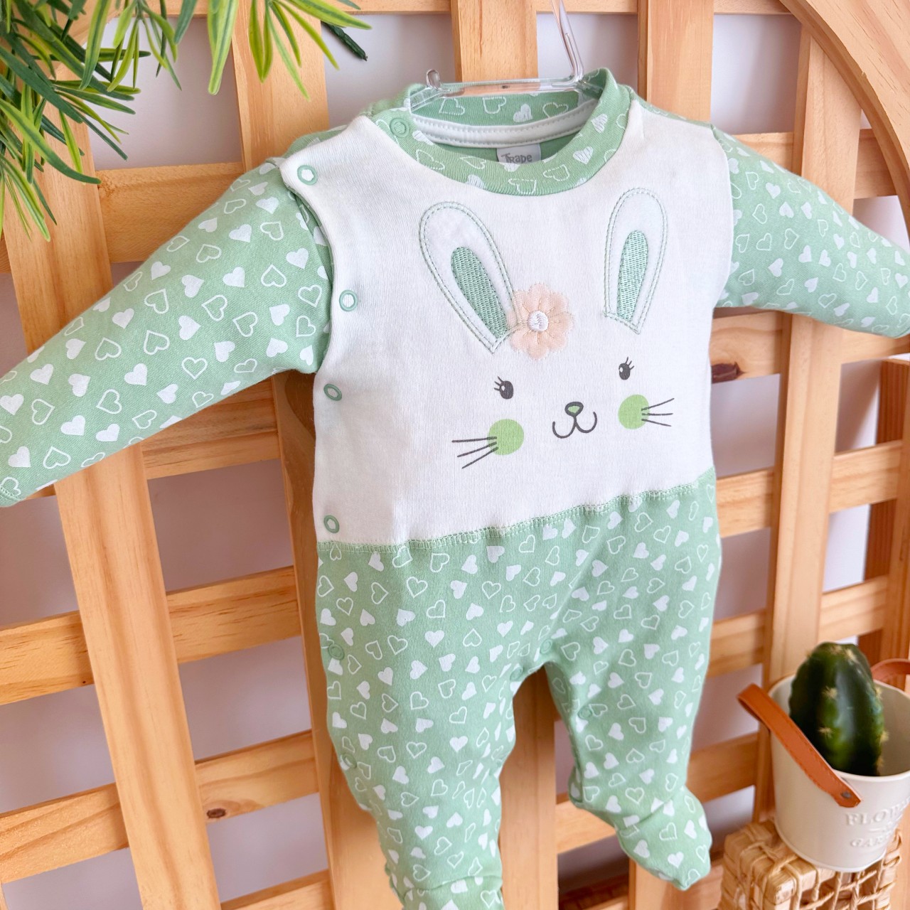 Macacão Trape Zape- Coelhinha com Flor Amarela - Verde com Coraçãozinho