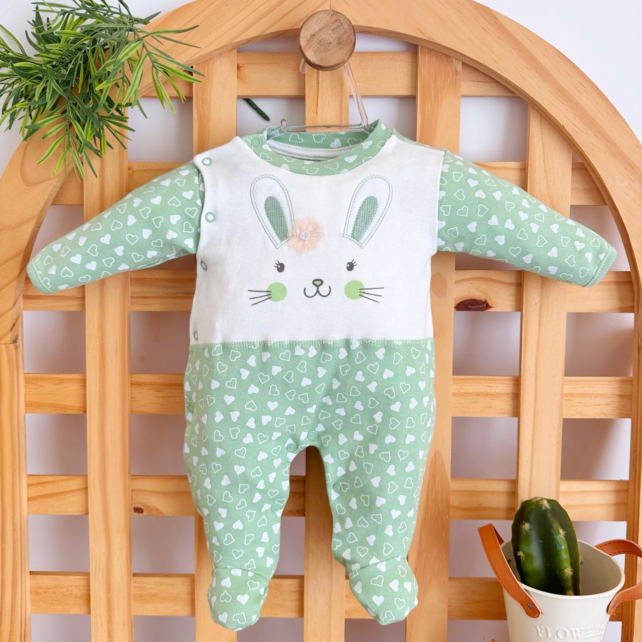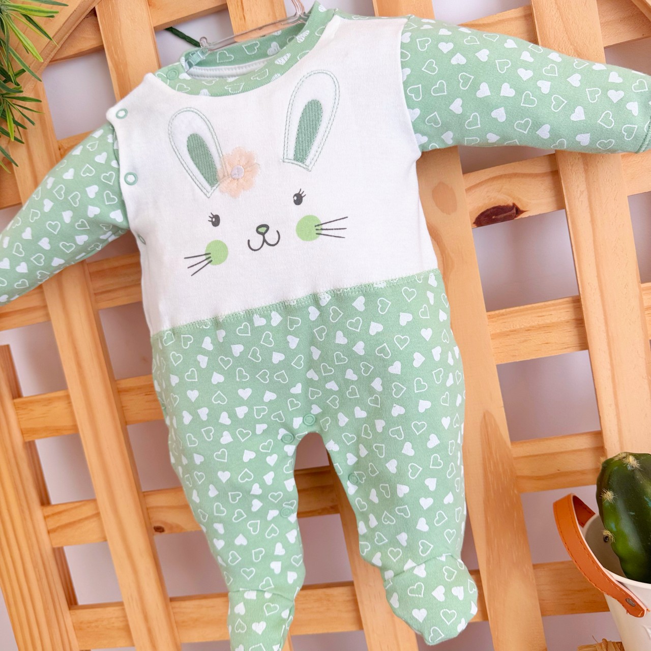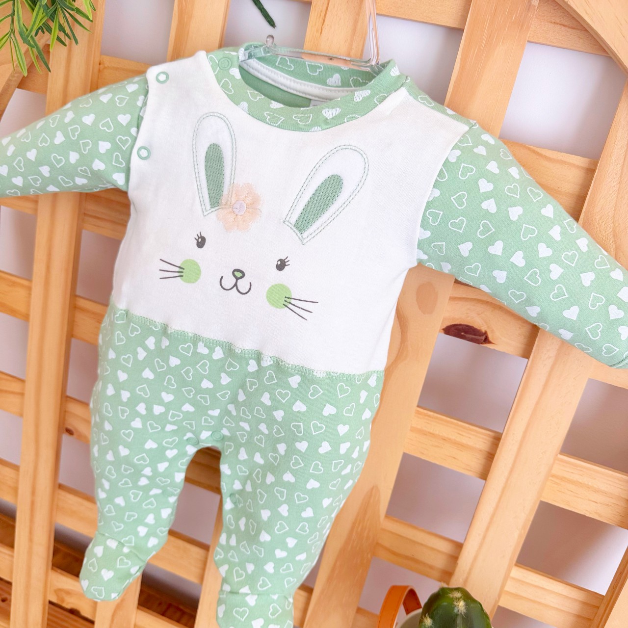 Macacão Trape Zape- Coelhinha com Flor Amarela - Verde com Coraçãozinho