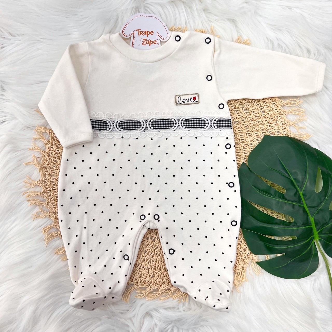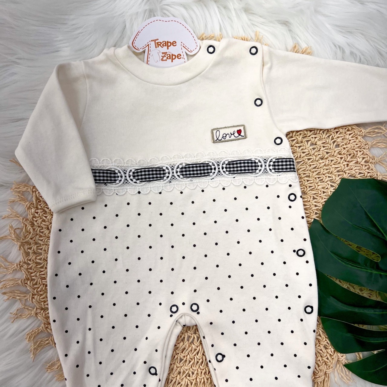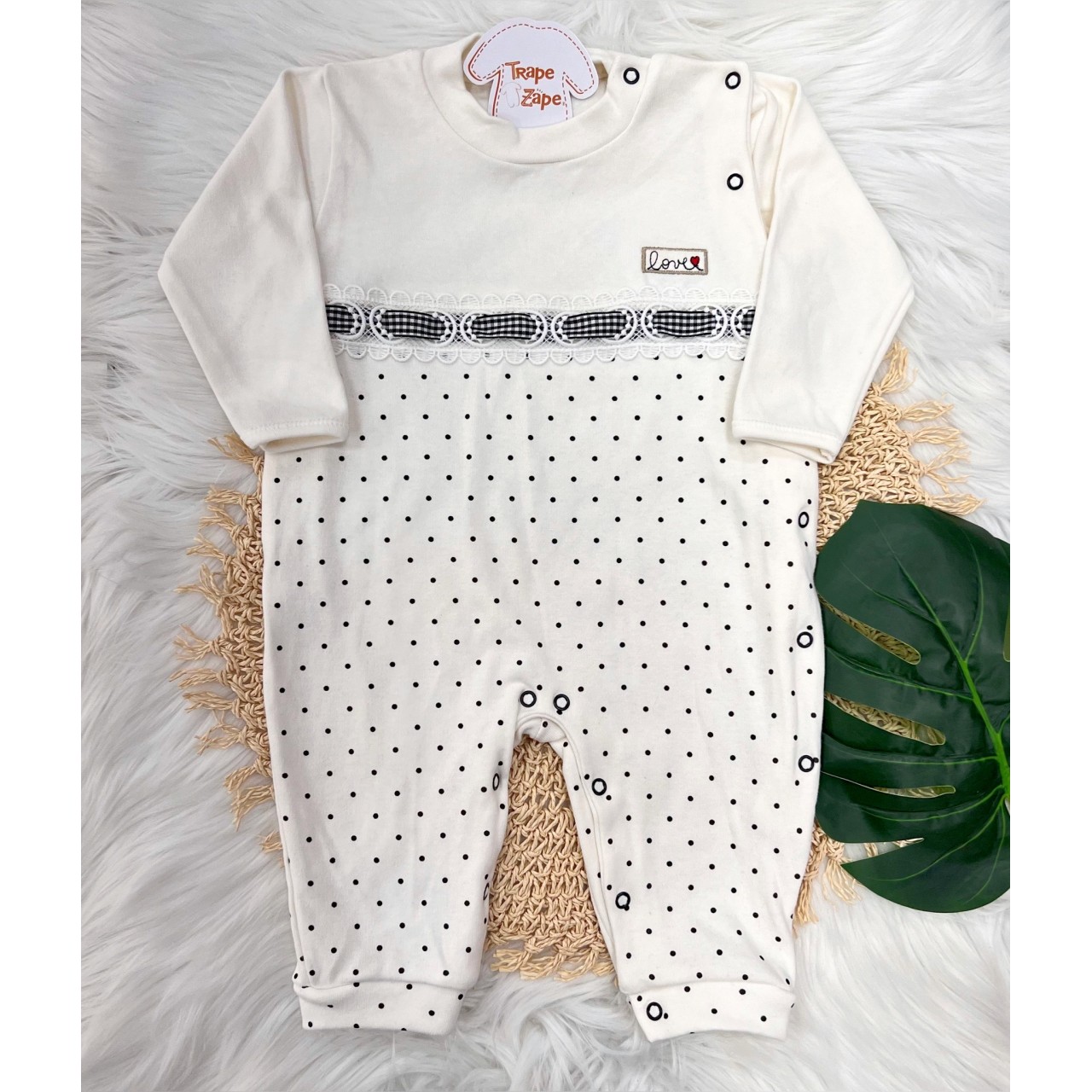 Macacão Trape Zape- Love off com poa preto