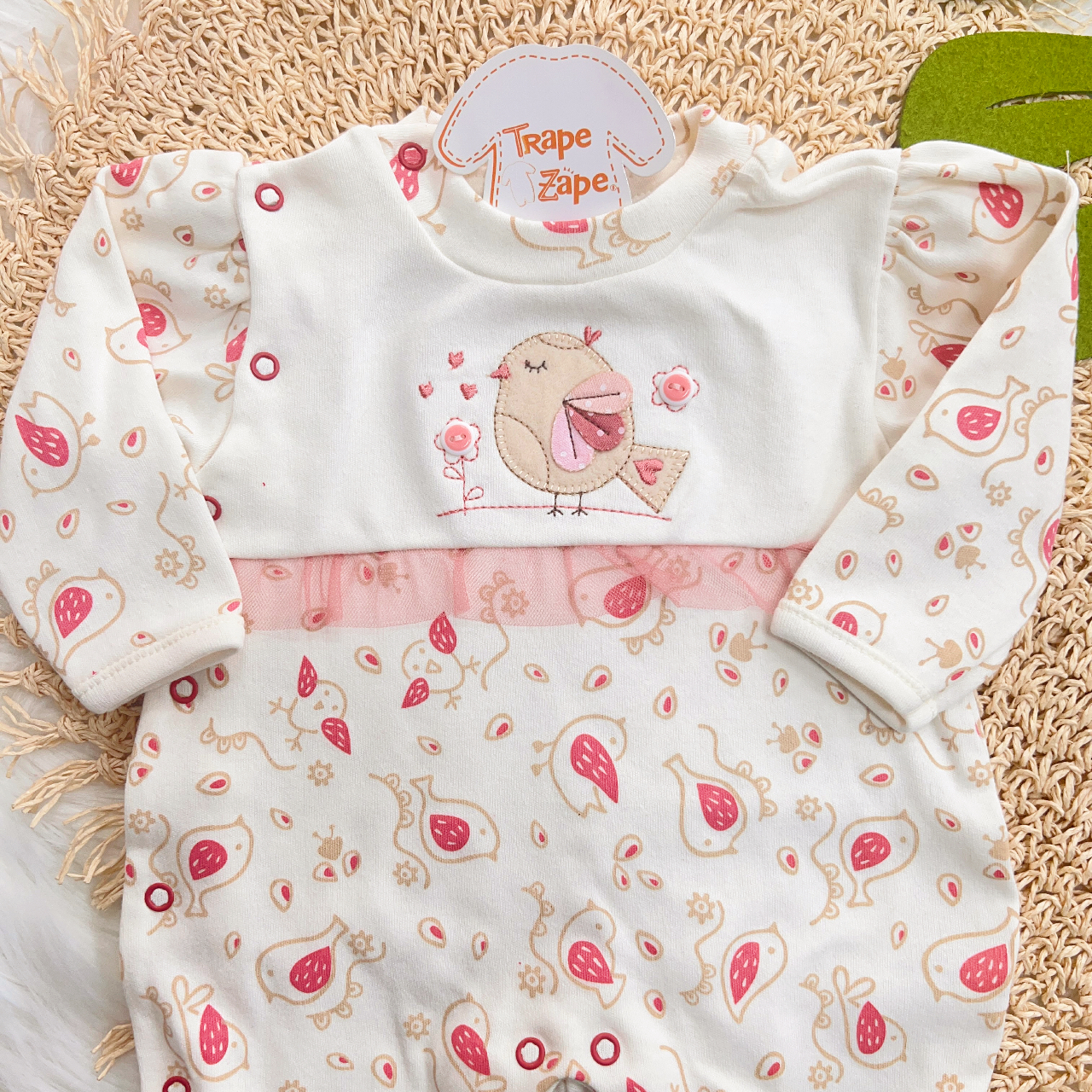 Macacão Trape Zape - Passarinha com Flores - Off White e Rose