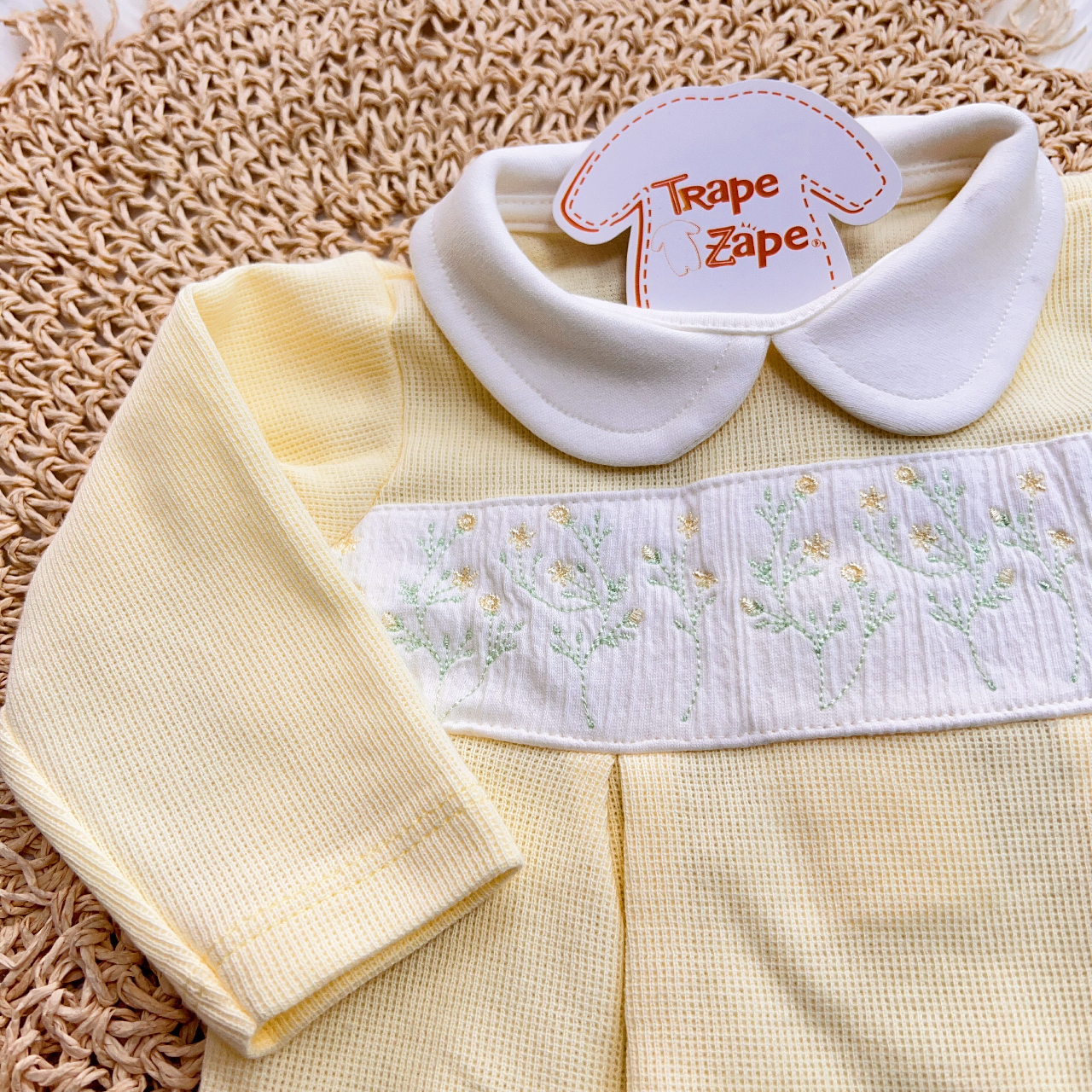 Macacão Tricotil (Tricot 100% Algodão) com Gola e Bordado - Amarelo com Flores Amarelas