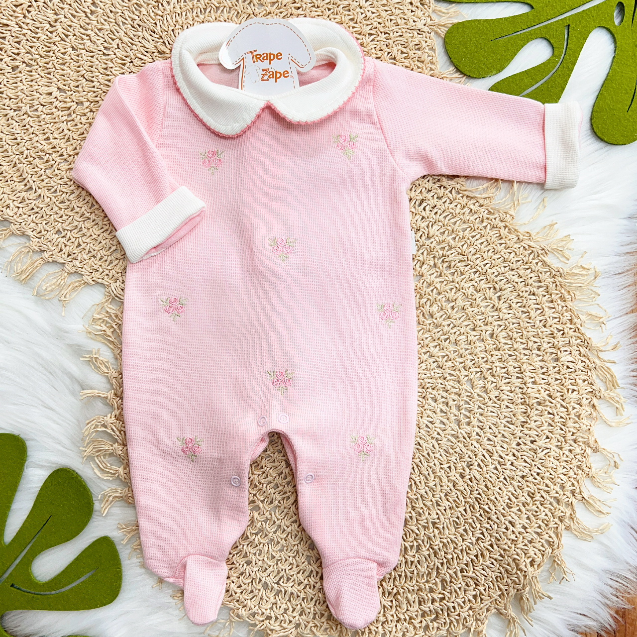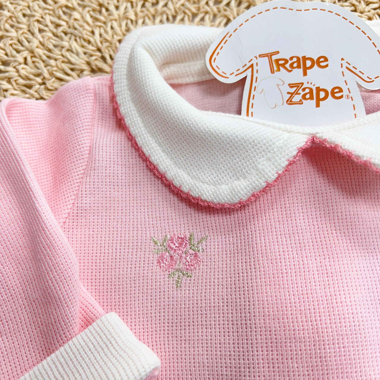 Macacão Tricotil (Tricot 100% Algodão) com Gola e Bordado - Rosa Três Flores