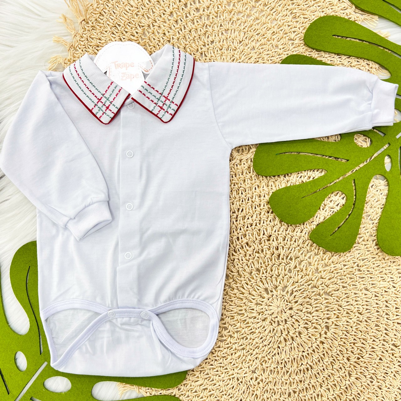 - Modelo: body gola bordada- pontilhado vermelho e verde