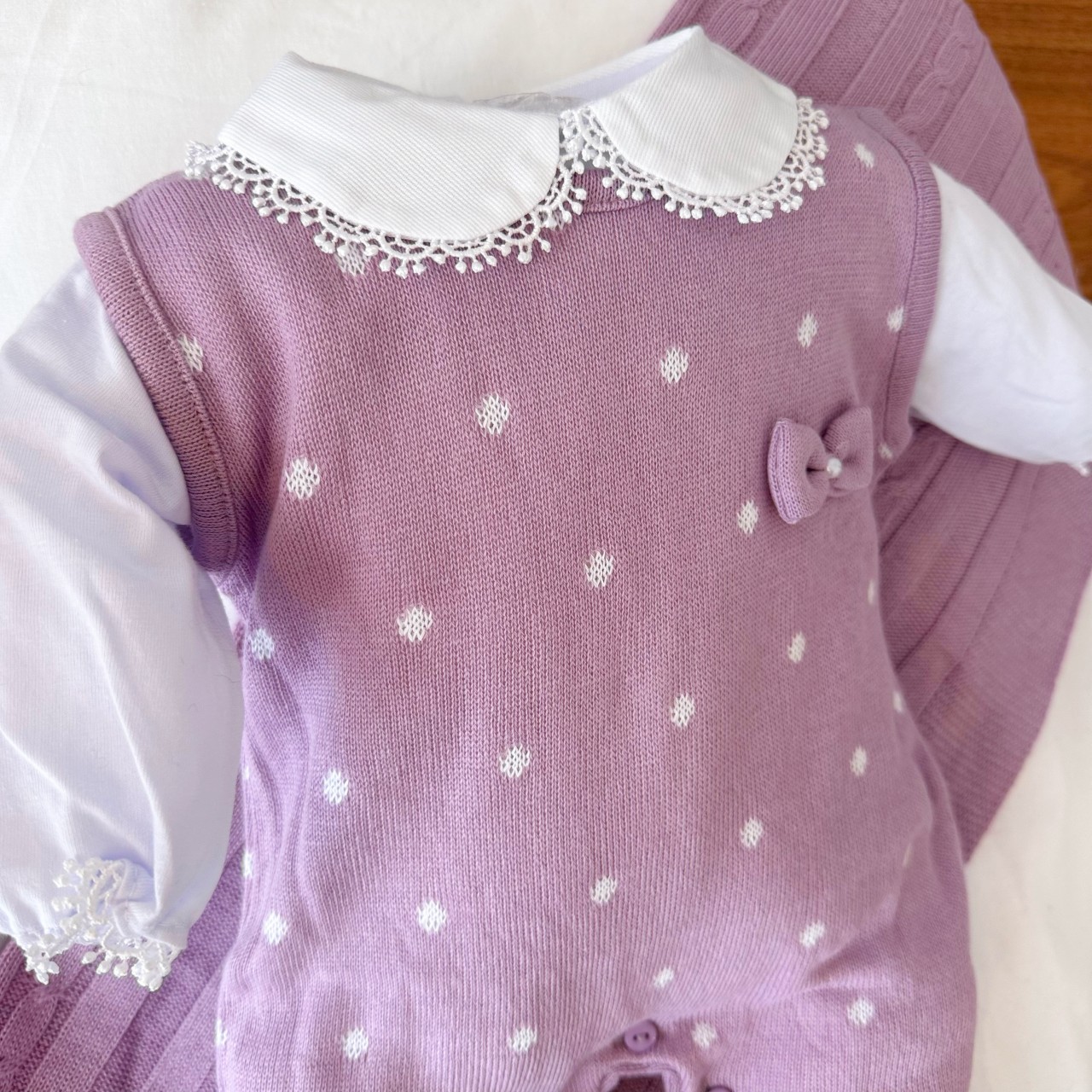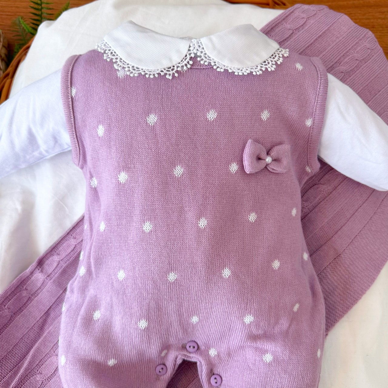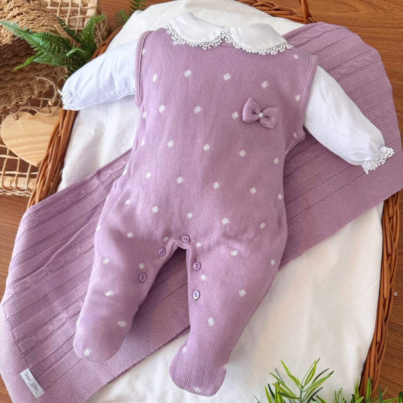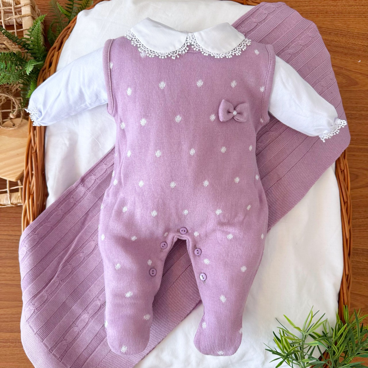 01- Macacão Salopete de Linha - 100% Acrílico01- Body Manga Longa - 100% Algodão01- Manta de Linha - 100% Acrílico